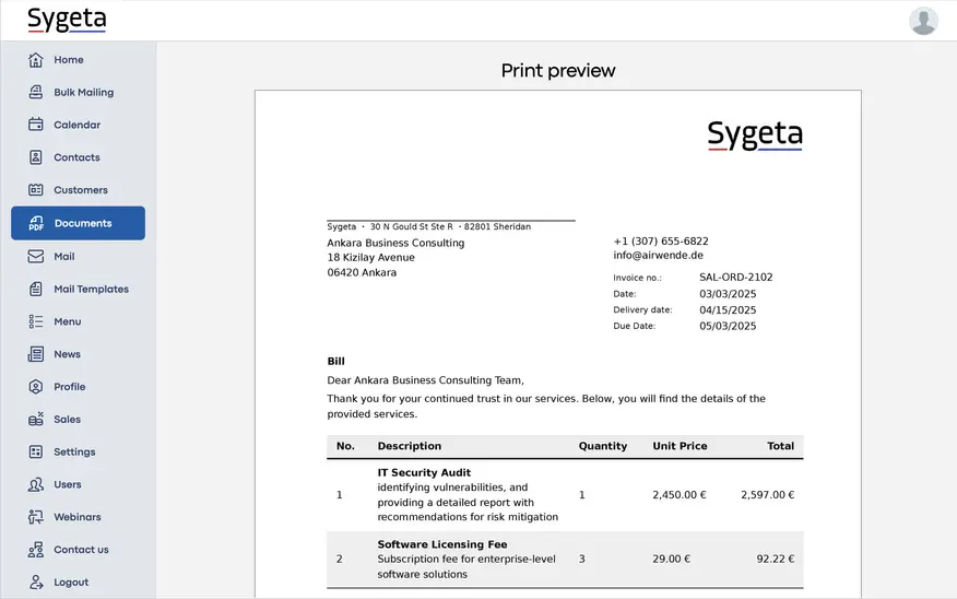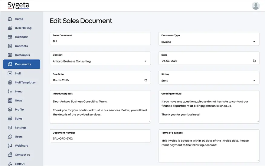 In the modern business world, efficient and professional document creation is crucial. With Sygeta CRM, you can automatically generate business letters, invoices, reminders, delivery notes, and many other documents in perfect design.